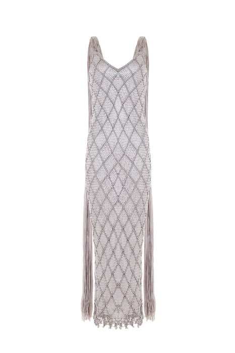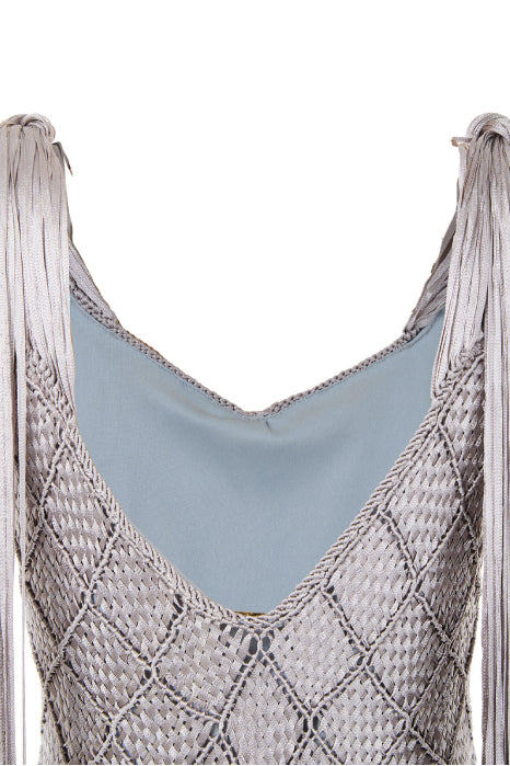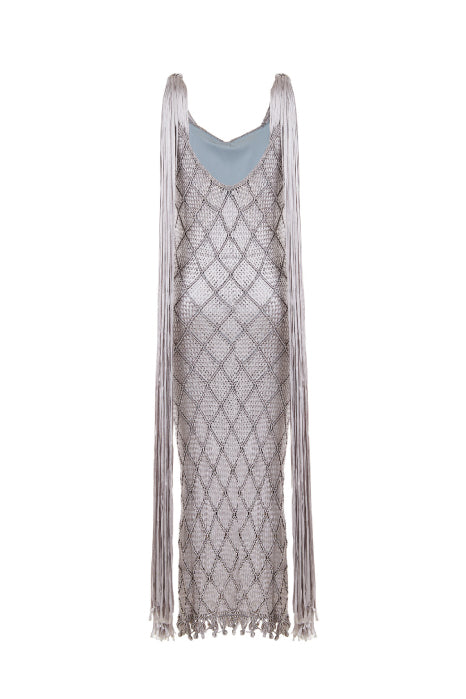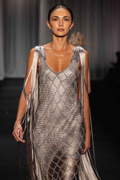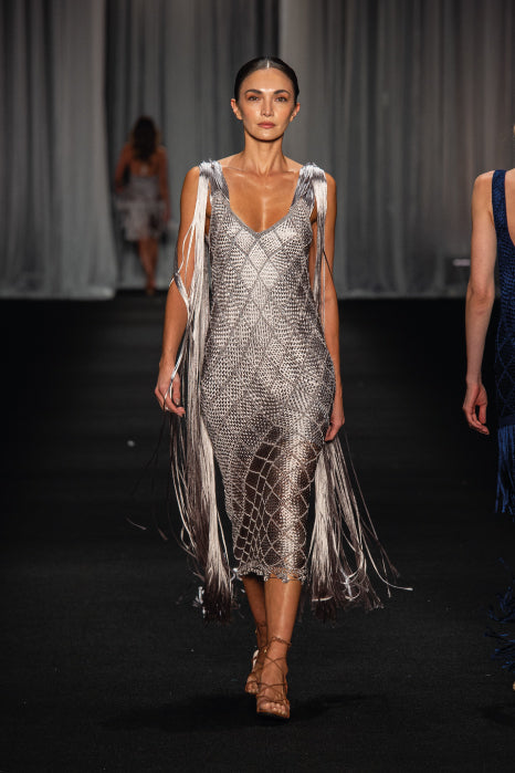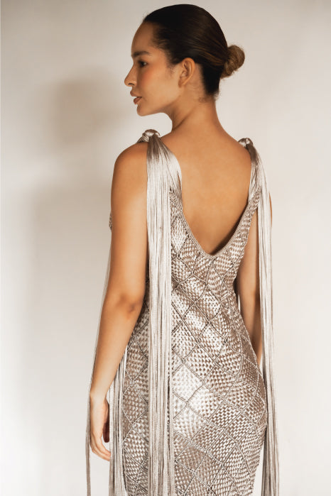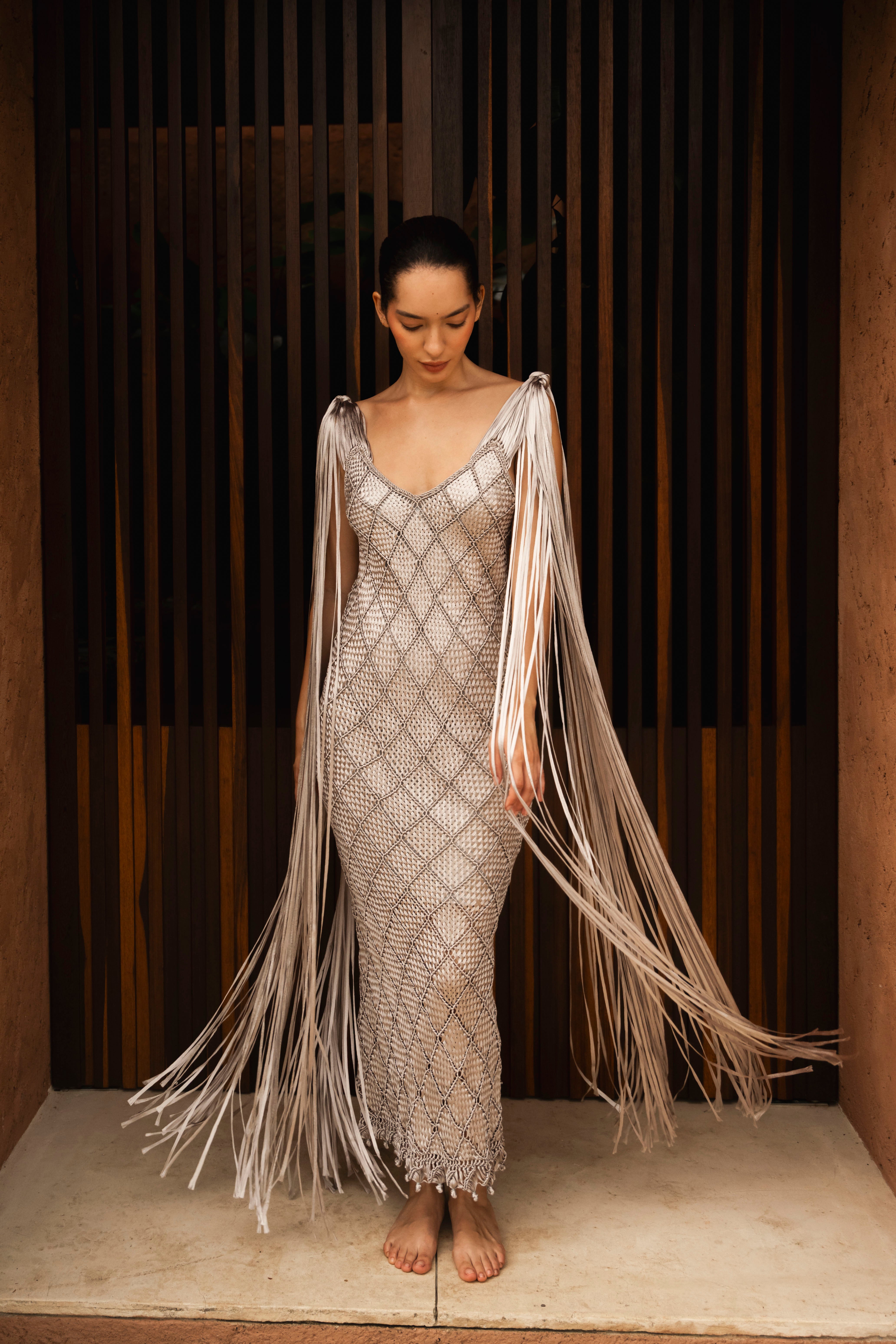 Nuestro vestido Alice, con una silueta ultra favorecedora, realza tu look con refinados flecos que caen desde los hombros. Es una expresión audaz de artesanía y elegancia. Esta pieza atemporal es perfecta para ocasiones especiales y elegantes.