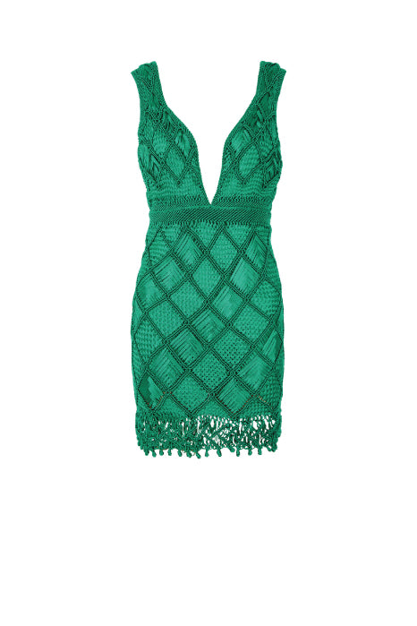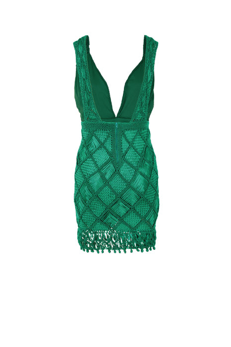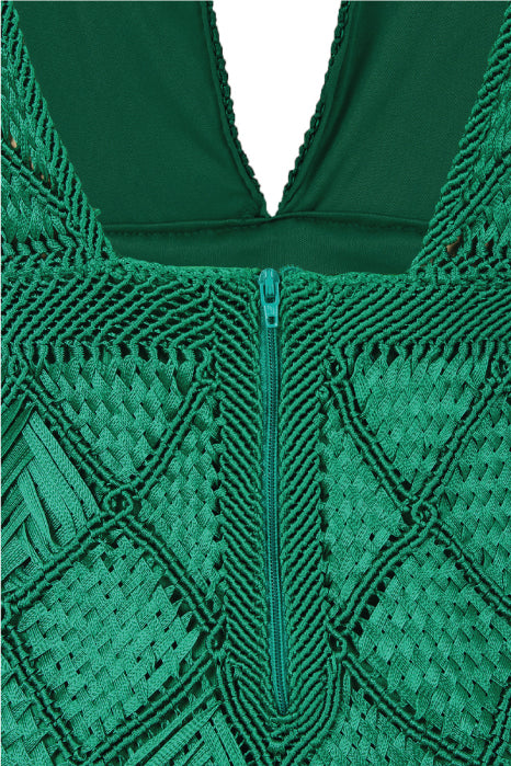 El vestido corto Kenza tejido a mano diseñado con un escote en V y tirantes gruesos, viene con silueta en línea A. Los detalles de su tejido lo convierten en una pieza versátil y atemporal. Perfecto para llevar durante el día y las interminables noches de verano.