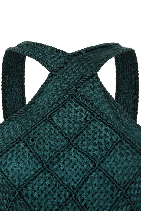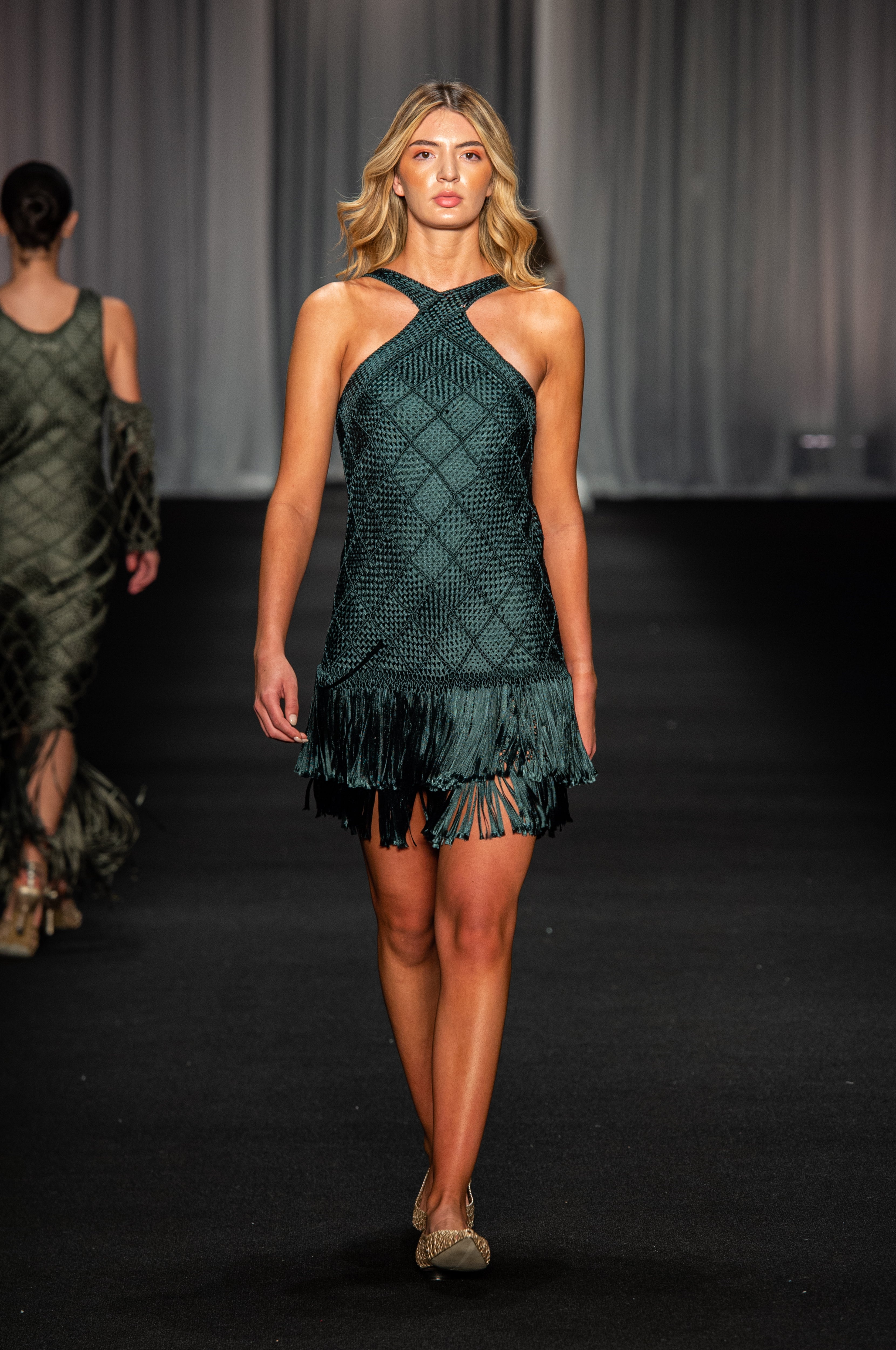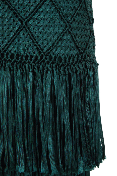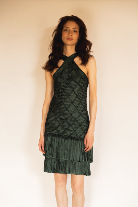 Nuestro vestido Ryu tejido a mano, diseñado con silueta ajustada que abraza la figura, manga sisa y cuello cruzado. Sus cascadas de flecos añaden un toque de elegancia femenina.