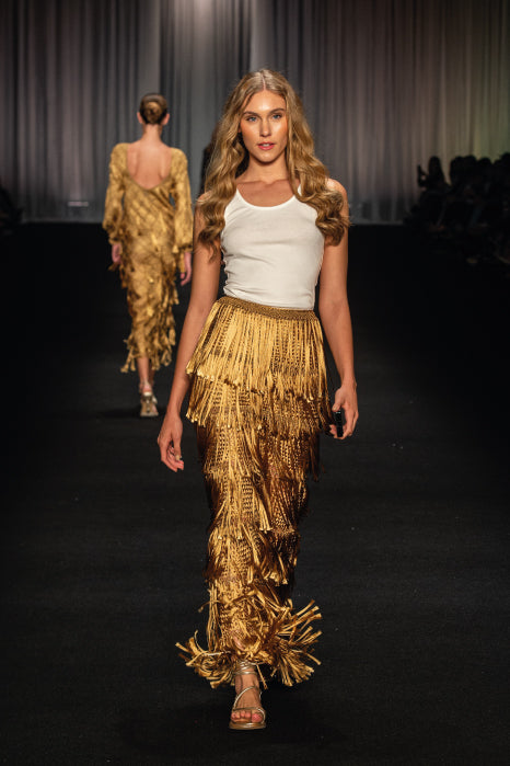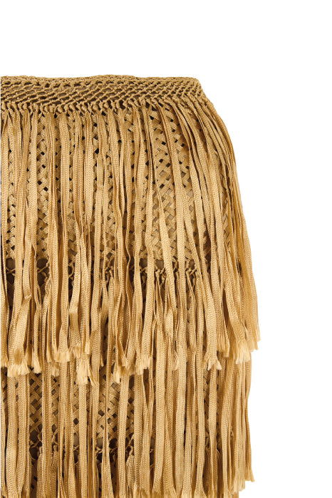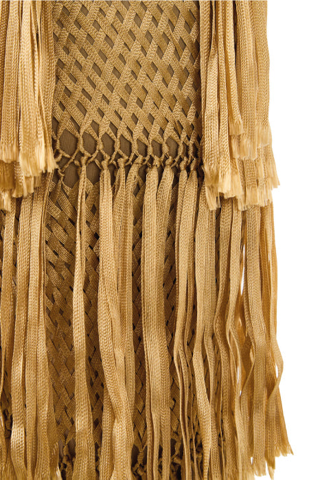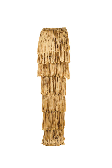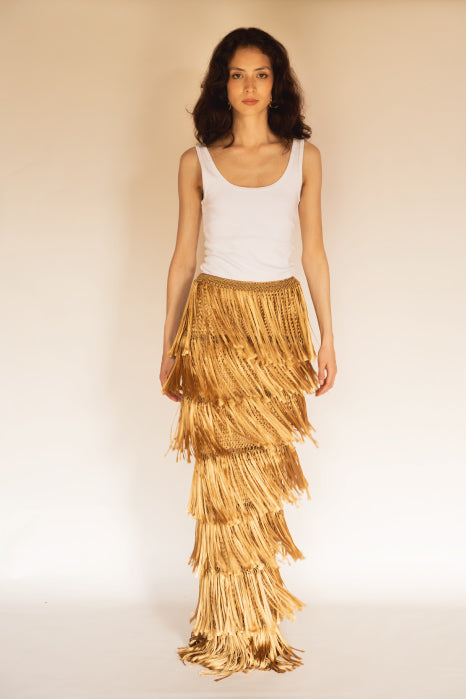 Nuestra falda Saman, meticulosamente tejida a mano, diseñada con varias capas de flecos en cascada. Una opción ideal para ocasiones especiales. Completa tu look con tu top favorito y unas flats para un toque veraniego y chic.