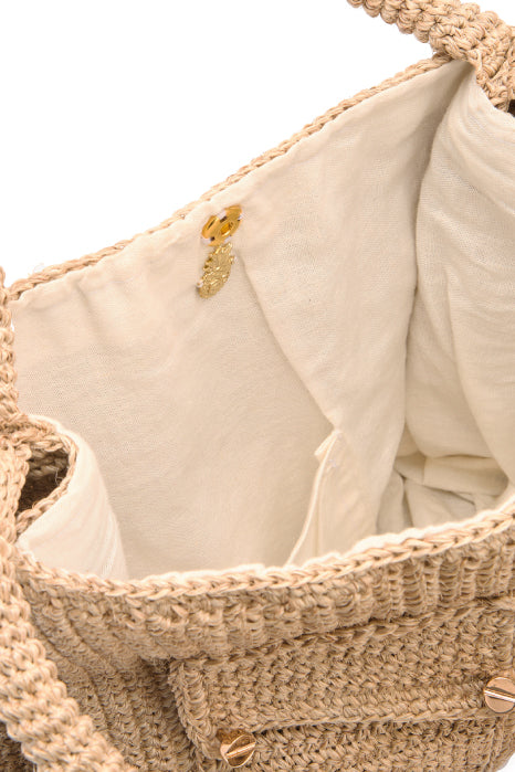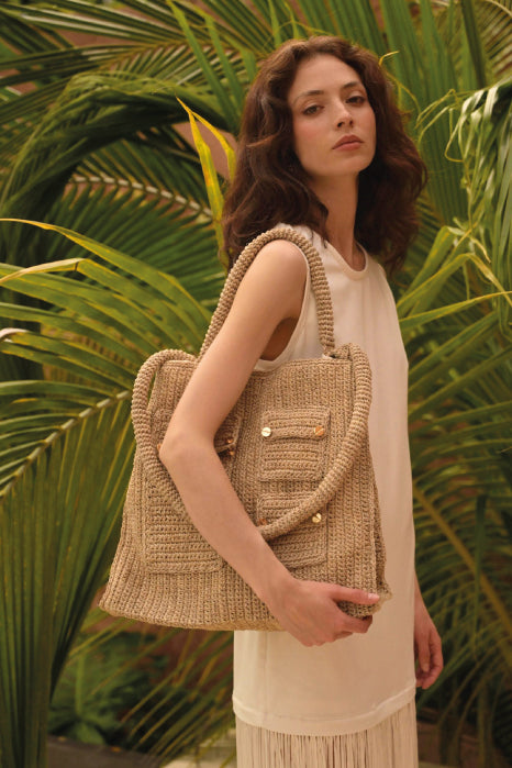 Completamente tejido a mano, este bolso artesanal es una celebración del diseño atemporal. Su textura natural y silueta versátil lo convierten en el compañero ideal para días soleados, escapadas de fin de semana o para dar un toque relajado a tu estilo diario.